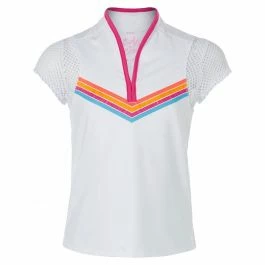 She’ll feel like the fashionista of the tennis court in this Lucky in Love Pretty in Ink Feelin Inky Top! It features a v-cut with contrast trim, mesh sleeves, side slits for a comfortable fit, elongated back hem for added coverage, and a comfortable, smooth to the touch performance fabric.