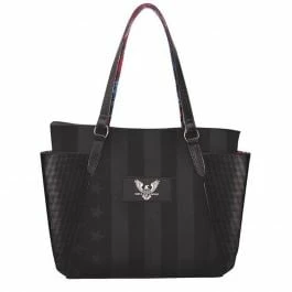 The Subtle Patriot Carry Tote is the “Transformer” of the tote world as it will change into the bag you need for whatever your lifestyle activity. Equipped with a padded laptop containment pocket, snap shut tablet pouch that doubles as a “carry” pocket, multiple zippered security compartments, two hydration ports and an oversized center pouch, this carry tote is perfect whether you’re on the way to the beach, yoga class, the office or an exotic destination. With antique silver hardware, protective bottom feet bag and right-sized, padded straps for side or shoulder carry, comfort and durability are guaranteed.
